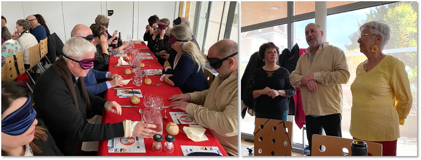 Mercredi 25 mars : Suite à notre action et le financement d'une cuisine pour aveugles et malvoyants, nous sommes reçus par l'association Valentin HAÜY de Chalon-sur-Saône. Afin de nous faire mettre dans la peau d'une personne aveugle pendant un moment heureusement limité, cette association invite notre club le temps d'un déjeuner les yeux bandés. Pour la plupart d'entre nous, c'est une première. C'est la découverte du monde de l'obscurité où seuls le toucher et le goût permettent d'identifier ce qui nous est proposé dans les verres et les assiettes.
